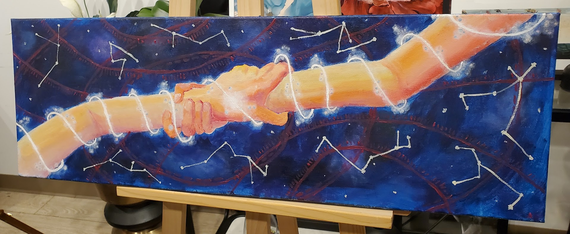 A painting I did recently was “Star Crossed Lovers”. This painting is inspired by all kinds of love and features two arms holding on to each other. I was adding finishing touches at a live event, and an older gentleman came over and asked if the hands were a man and woman’s or two women’s. I told him that it didn’t matter, because it is up for the audience’s interpretation. I believe that the half the fun in art is seeking your own answers within the piece. It’s also interesting to learn about and strive to understand how the artist and audience’s background affect the creation and interpretation of the piece. Symbols and colors and shapes can have different meanings depending on culture and lifestyle and all the other little things that make us who we are.